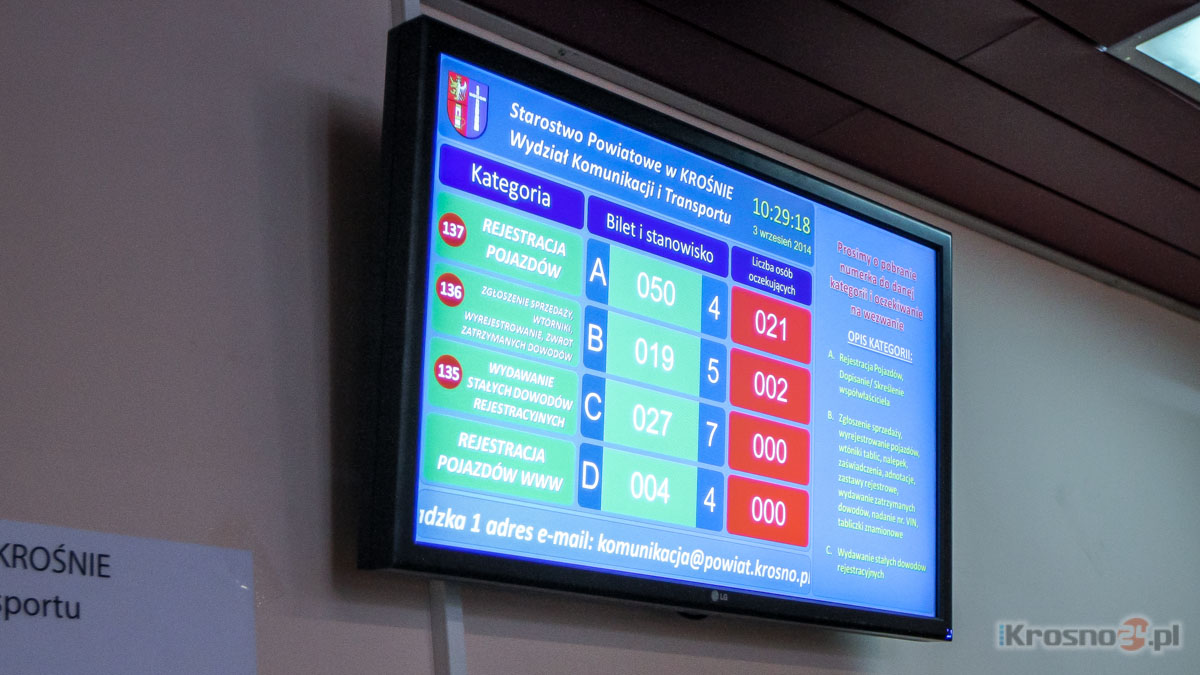 Wiadomość W Starostwie automat pilnuje kolejki"Po niedawnym wprowadzeniu automatu wydającego numerki w Wydziale Komunikacji Starostwa Powiatowego w Krośnie, ma tam miejsce dziwna sytuacja. Bardzo słabo to wygląda" – pisze do nas pan Paweł. Sprawdziliśmy to. W dalszej części wiadomości czytelnik szczegółowo opisuje problem: - "Aby zarejestrować pojazd, co rano o godz. 7.00, tworzy się ogromna kolejka w celu pobrania numerka. Automat wydaje 55 numerków, bo tyle są w stanie obsłużyć 3 osoby zajmujące się rejestracją pojazdów. Niestety, zaraz po otwarciu brakuje numerków dla wielu osób. W ciągu dnia przychodzi też bardzo dużo ludzi, którzy chcą zarejestrować samochód, ale zostają odprawieni z kwitkiem". - "Kolejki zawsze tam były, jednak odstało się godzinę i udało się wszystko załatwić. W tej chwili trzeba poświęcić na bezsensowne stanie w kolejce cały dzień: o 7.00 wziąć numerek i czekać na swoją kolej do 13.00-14.00. I to wszystko, aby załatwić jedną prostą sprawę" - żali się pan Paweł. Sprawdziliśmy, jak działa nowy system kolejkowy w Starostwie Powiatowym. W poczekalni Jest środa, 3 września, około godziny 10.00. Pod drzwiami pokoju, w którym dokonywana jest rejestracja pojazdów, czeka kilka osób. Obok drzwi stoi automat wydający numerki. To on rządzi kolejką. Aby do niej dołączyć, wystarczy kliknąć jeden z trzech typów spraw, z którą przyszliśmy do Wydziału Komunikacji: rejestracja pojazdów; zgłoszenia sprzedaży, wtórniki, wyrejestrowanie, zwrot zatrzymanych dokumentów; wydawanie stałych dowodów rejestracyjnych. Zdecydowana większość osób przychodzi tu, aby zarejestrować pojazd. Po kliknięciu automat drukuje bilecik, dzięki któremu stajemy się pełnoprawnym kolejkowiczem. O długości kolejki dowiadujemy się zarówno z bileciku, jak i z wiszącego na ścianie ekranu.