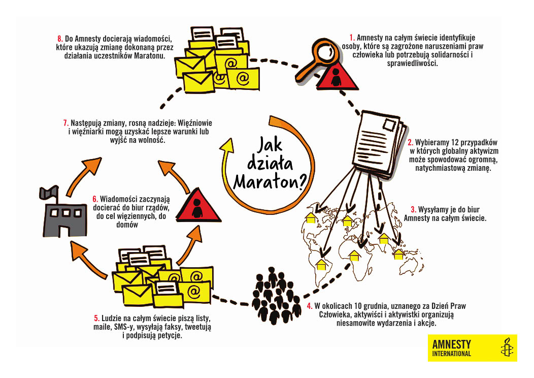 Wiadomość Napisz list w obronie praw człowiekaOd 15 lat na całym świecie odbywa się „Maraton pisania listów” w obronie praw człowieka. Akcję organizuje Amnesty International. W Krośnie, listy, które mogą zmienić życie prześladowanych osób, pisane będą w PWSZ (9.12) oraz w Pedagogicznej Bibliotece Wojewódzkiej (12-13.12). ![]() Amnesty International już po raz piętnasty organizuje "Maraton pisania listów" w obronie praw człowieka W 2012 r. Amnesty International odnotowała przypadki łamania praw człowieka w 159 krajach na całym świecie. Były to m.in. tortury, zabójstwa, przymusowe wysiedlenia, zaginięcia i stosowanie przemocy wobec kobiet. Od ponad 50 lat Amnesty International broni praw osób pokrzywdzonych ze względu na rasę, płeć, narodowość, wyznanie czy poglądy polityczne. Jedną z najgłośniejszych akcji prowadzonych przez organizację jest coroczny „Maraton pisania listów”. Odbywa się on w okolicach Międzynarodowego Dnia Praw Człowieka (10.12). Polacy biorą udział w akcji od 2001 r. Podczas maratonu powstają apele do władz oraz listy solidarności do osób, których prawa są łamane. - Twoje słowa mogą pomóc uwolnić więźniów, postawić torturujących przed sądem i zmienić prawo, tam, gdzie niewystarczająco chroni ono prawa człowieka. Im więcej listów napiszemy, tym większa szansa, że uda nam się poprawić los danego bohatera lub bohaterki – czytamy na stronie Amnesty International. Podczas każdego maratonu Amnesty International wybiera kilkanaście osób (lub grup ludzi) potrzebujących natychmiastowej pomocy, w obronie których pisane są listy. W tym roku jest ich jedenaście. Jednym z nich jest ukraiński reżyser filmowy Oleg Seńcow. Nocą z 10 na 11 maja 2014 roku został on zatrzymany na Krymie przez funkcjonariuszy rosyjskiej Federalnej Służby Bezpieczeństwa. Przewieziono go do Moskwy, gdzie cały czas jest przetrzymywany pod zarzutem dokonywania aktów terrorystycznych. W rzeczywistości Seńcow brał udział w pokojowych demonstracjach Euromajdanu w Kijowie oraz przeciwko rosyjskiej interwencji na Krymie. W więzieniu próbowano zmusić go do przyznania się do winy. Był bity. Ściągano mu również spodnie i grożono gwałtem. ![]() W tym roku będzie można napisać list m.in. w obronie Olega Seńcowa - ukraińskiego reżysera filmowego, bezprawnie więzionego w Moskwie W całej Polsce listy pisane będą w ponad 450 miejscach. W Krośnie – w dwóch: 9 grudnia w bibliotece PWSZ (ul. Rynek 1) oraz w dniach 12-13 grudnia w Pedagogicznej Bibliotece Wojewódzkiej (ul. Grodzka 45B). List może napisać każdy, w dowolnym języku. Wszystkie osoby zainteresowane udziałem w projekcie otrzymają wzór listu oraz sylwetki osób, na rzecz których pisane będą listy. PWSZ łączy maraton (godz. 8.00-20.00) z warsztatami pt. „Powiedz to, co myślisz słowem, gestem i obrazem”. Rozpoczną się one o godz. 11.00 w auli przy ul. Kazimierza Wielkiego 4. - Organizowane przez nas wykłady, warsztaty oraz wystawy i ćwiczenia multimedialne mają pomóc słuchaczom w swobodnym formułowaniu swych myśli i spostrzeżeń, budowaniu wrażliwości w postrzeganiu otaczającego ich świata oraz zapoznaniu się z językami obcymi niezbędnymi w komunikacji z różnymi narodami świata – informuje prof. Grzegorz Przebinda, rektor PWSZ. Szczegółowy program warsztatów można znaleźć tutaj. Pedagogiczna Biblioteka Wojewódzka bierze udział w maratonie od kilku lat. W tym roku listy będzie można w niej pisać w piątek (12.12) w godz. 9.00-17.00 oraz w sobotę (13.12) w godz. 9.00-14.00. - Nasze listy potrafią zmienić sytuację osób, w sprawie których je piszemy. Po ubiegłorocznej akcji o 10 lat skrócono wyrok pozbawienia wolności dr. Tun Aunga z Birmy, Michaił Kosenko został zwolniony ze szpitala psychiatrycznego, a Aleś Bialacki i Jauber Mejri - więźniowie sumienia - zostali uwolnieni. Te listy są naprawdę skuteczne - przekonuje Wojciech Byczyński, koordynator maratonu w Krośnie. Listy można podpisywać także przez internet, poprzez stronę Amnesty International. (2014-12-08/13:05:11) |