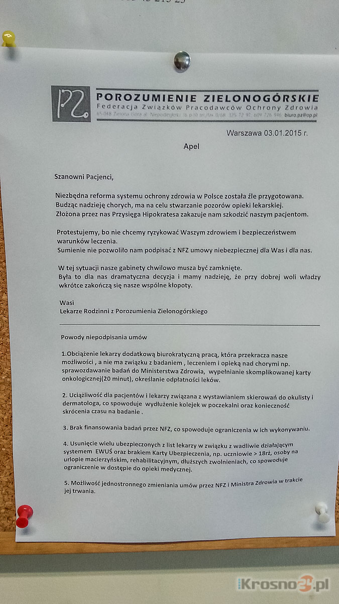 Wiadomość Oni się tam kłócą, a my pacjenci cierpimyOd piątku (2.01) w dostępie do podstawowej opieki zdrowotnej nie zmieniło się nic. W Krośnie nadal tylko dwie placówki udzielają chorym pomocy (na ul. Kletówka i Portiusa). Ci, którzy nie otrzymają jej w swojej przychodni, jadą do szpitala. A wszystko podobno dla dobra pacjentów. ![]() Ani Minister Zdrowia, ani lekarze Porozumienia Zielonogórskiego nie chcą ustąpić, dlatego część przychodni w kraju nadal nie przyjmuje pacjentów. W Krośnie od początku roku otwarte są tylko dwie Poniedziałek rano (5.01), przychodnia na Paderewskiego. Drzwi do rejestracji zamknięte, na drzwiach dwie kartki: jedna już znana ("Z przykrością informujemy..."), druga – całkiem nowa – wyjaśnia pacjentom zasady udostępniania ich dokumentacji medycznej. Zasady te są takie: o potrzebie otrzymania dokumentacji pacjent musi poinformować przychodnię na piśmie, kierując wniosek na adres przychodni lub wysyłając go mailem. We wniosku musi wskazać jaka dokumentacja i za jaki okres jest mu potrzebna oraz podać swoje dane kontaktowe. Sposób niezwłocznego wydania dokumentów zostanie ustalony z pacjentem telefonicznie, a jeśli nie zostanie ustalony, przychodnia wyśle je pocztą. W rejestracji nie widać niestety nikogo, kto odebrałby wniosek czy powiedział, ile procedura udostępniania potrwa: pięć minut, godzinę czy tydzień? ![]() Zgaszone światło, barykada z krzeseł i kartki na ladzie. Dzisiaj rano taki widok witał pacjentów w przychodni na ul. Wojska Polskiego. Wejście do poczekalni w przychodni na Wojska Polskiego zastawiono ławką z trzema krzesłami. Tu też nikogo w rejestracji nie ma. Są za to dwie identyczne kartki, telefon, który dzwoni na próżno non stop i pacjenci, którzy na próżno tu przyszli. Jednym z nich jest pan Marek. Właśnie odpisuje z drugiej kartki adres poczty elektronicznej. Najbardziej zależy mu na dostępie do zaświadczenia, które upoważnia jego lekarza rodzinnego do wypisania silnych leków. - Te dwie to pauzy są czy coś innego? - pyta o kreski w adresie email. - Potrzebuję tych dokumentów już, teraz, bo chcę jeszcze dziś iść do lekarza. A tu co? Pisz pan sobie na Berdyczów. Matka pana Marka, 86-lat, należy do przychodni na Naftowej. Ma zakrzepicę żył, bierze leki rozrzedzające krew i musi być regularnie monitorowana. Co dwa tygodnie pobierają jej krew, sprawdzają krzepliwość i inne parametry, lekarz dobiera odpowiednią dawkę medykamentu. Dzisiaj, z przychodni miała przyjść do niej pielęgniarka na pobranie. Nie przyjdzie. - Mama nie chodzi, nie mogę jej przenieść i zawieźć do szpitala – żali się. - Jest taka opcja, że zawiezie ją tam pogotowie, ale do tego potrzebne jest skierowanie od lekarza rodzinnego, a lekarz rodzinny nie przyjmuje. Co mam zrobić? ![]() Treść kartki po lewej znana jest od piątku. Kartka po prawej jest nowa i zawiera opis zasad udostępniania pacjentom ich dokumentacji medycznej Pan Marek nie chce wnikać w istotę sporu, nie obchodzi go, kto jest właścicielem przychodni czy budynku, nie bardzo chce mu się też słuchać o co burzy się Arłukowicz, a czego chcą lekarze. Chciałby, żeby ktoś te pozamykane przychodnie otworzył. - Zrobię sobie jednak zdjęcie tego adresu email, żeby nie pomylić. Wyciąga telefon, cyk. W przychodni na ul. Kletówka też jest pusto, choć jako jedna z dwóch placówek POZ w Krośnie jest otwarta. - Przyjmujemy od 13.30, dlatego nikogo nie ma – wyjaśniają pielęgniarki. Przychodnia nie należy do Porozumienia Zielonogórskiego, podpisała umowę z NFZ i otworzyła drzwi dla swoich pacjentów. Chorzy zapisani do innych lekarzy rodzinnych dzwonią tu od piątku. - Pytają czy ich przyjmiemy. Przyjmiemy, jeśli się do nas przepiszą. Jeśli nie, to tylko wizyta prywatna. W poczekalni Szpitalnego Oddziału Ratunkowego na Korczyńskiej (w piątek utworzono tu dodatkowy punkt POZ) są dwie kolejki: kolejka do lekarza i kolejka do rejestracji. W obydwu czeka po kilkanaście osób. Czasami jest pewne zamieszanie, bo pacjenci nie wiedzą, w której kolejce aktualnie czekają. Najważniejsze jednak jest to, że oprócz kolejek są tu lekarze, którzy ich przyjmują. – W piątek przyjęliśmy 58 pacjentów dorosłych i 26 dzieci. Było także 10 zabiegów pielęgnacyjnych – wylicza dr inż. Piotr Lenik, dyrektor Podkarpackiego Szpitala Wojewódzkiego w Krośnie. – Świadczenia udzielane są w dwóch gabinetach, ale przygotowujemy kolejne dwa. Mamy dodatkowych 200 metrów kw. powierzchni na wypadek gdyby ludzi było więcej i gdyby okres zamknięcia przychodni się przedłużał. Nie każdy chciał tu przyjść. – Bo jak to, do szpitala po receptę uderzać? To bez sensu zawracać im takim czymś głowę – złości się jedna z pacjentek. Nikt inny nie mógł jej jednak recepty wypisać. No chyba, że prywatnie. – Ale prywatnie to nie zawsze leki refundują. I za nie może trzeba będzie jeszcze zapłacić 100 procent. Kolejny pacjent opowiada, że zanim przyszedł tutaj, odwiedził cztery przychodnie. Wszystkie były zamknięte. Dopiero w czwartej dowiedział się od innego pacjenta, że musi jechać do szpitala. Jest na emeryturze. W poczekalni SOR wisi telewizor. Trwa transmisja konferencji lekarzy Porozumienia Zielonogórskiego. Tłumaczą, dlaczego nie mogą otworzyć gabinetów, jak chce minister (to jego warunek, aby możliwe było wznowienie rozmów): - W momencie, gdy nie mamy kontraktu pacjent przychodzi do nas, jak do gabinetu prywatnego. My nie chcemy przyjmować komercyjnie, bo pacjentom należy się bezpłatna opieka, bo płacą składki zdrowotne. Padają też słowa o szacunku do pacjenta, braku szacunku, jakim darzy ich minister, naciskach i szantażu. Pojawia się również zapowiedź ogólnopolskiego strajku lekarzy. Gdy skończy się ta konferencja, swoją zorganizuje zapewne Minister Zdrowia. Odwoła się do etyki, wspomni Hipokratesa i wskaże d