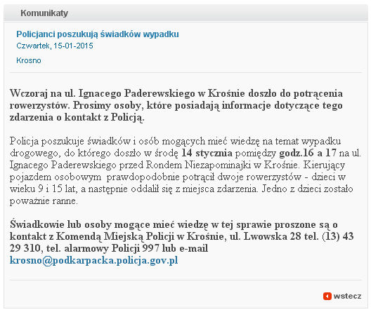 Wiadomość ''To nie było potrącenie!'' Relacja świadka zdarzeniaPo publikacji artykułu dotyczącego wypadku na ul. Paderewskiego, w piątek do redakcji zgłosił się świadek zdarzenia – kobieta, która była pasażerką białej taksówki. Według jej relacji nie doszło do potrącenia, a upadku, który spowodowany był nadmierną prędkością kierującego rowerem chłopca. ![]() W piątek w redakcji pojawiła się kobieta, która była świadkiem wypadku na ul. Paderewskiego. Jej opis zdarzeń różni się od opisu, który przedstawiły poszkodowane dzieci Dla przypomnienia: w środę (14.01), po godz. 16.00, na ul. Paderewskiego doszło do wypadku z udziałem dwójki dzieci – niemal 16-letniego Wojtka i 9-letniej Angeliki. Według ich relacji, dzieci zostały potrącone na przejściu dla pieszych przez białą taksówkę. - To ja byłam pasażerką tej taksówki – przedstawiła się kobieta, która w piątek (23.01) odwiedziła redakcję. - Dzieci nie zostały potrącone! Kobieta wsiadła do taksówki na ul. Kletówka. Samochód jechał w dół, w kierunku ul. Podwale. Rower, którym poruszały się dzieci, od razu zwrócił jej uwagę: - Była 16.15. Chłopiec jechał bardzo szybko. Dziewczynka siedziała na ramie. Jechali drogą, blisko krawężnika, z bardzo dużą prędkością. Nawet rozmawialiśmy z kierowcą, że zaraz dojdzie do jakiegoś nieszczęścia. ![]() Policja ustala, która z wersji jest prawdziwa. Niestety, funkcjonariusze od samego początku nie udzielają właściwie żadnych informacji w tej sprawie Ruch rzeczywiście był duży, samochody czekały na skręt w ulicę Podwale. Gdy rower zbliżył się do korka, zaczął hamować. - Przy takiej prędkości nie było to możliwe. Chłopak przeleciał przez kierownicę i wylądował poza drogą. Krwawił, ale był przytomny. Dziewczynka bardzo płakała. Niemal natychmiast do dzieci podbiegł jakiś mężczyzna. Dzięki Bogu, że dziewczynce nic się nie stało – relacjonuje kobieta. Kobieta zeznawała już na policji (kierowca taksówki także). Z tego co wie, na samochodzie nie stwierdzono żadnych wgnieceń. Dlaczego nie zatrzymali się, aby pomóc dzieciom? - Pewnie dlatego, że widzieliśmy, że przy poszkodowanych byli już ludzie, którzy udzielali im pomocy – odpowiada. Policja ustala, która z wersji wydarzeń na ul. Paderewskiego jest prawdziwa. ![]() Redakcja dwukrotnie dopytywała policję o przebieg zdarzenia. Komenda nie udzieliła informacji szerszych niż te zawarte w powyższym komunikacie. Jest w nim stwierdzenie, że doszło do potrącenia. Błędna jest też nazwa ronda