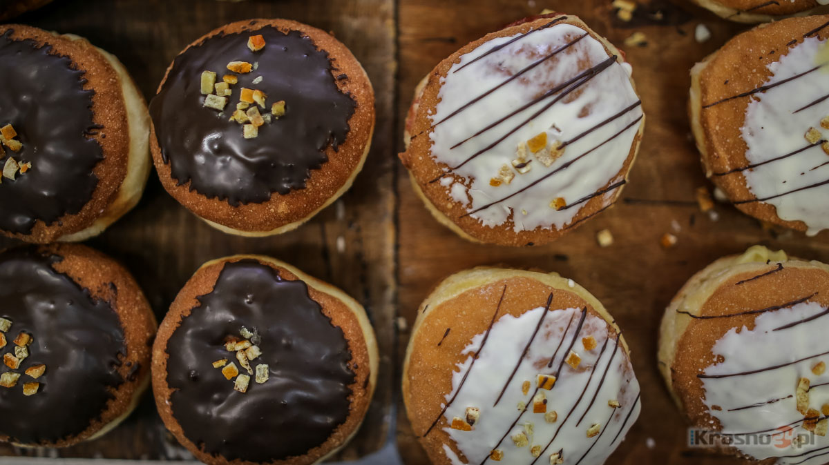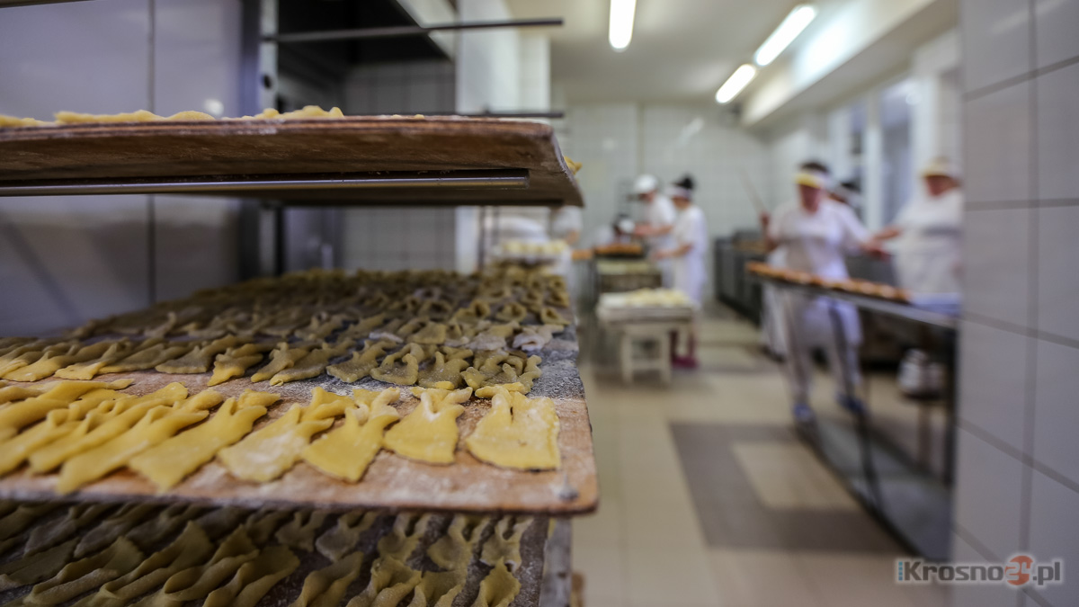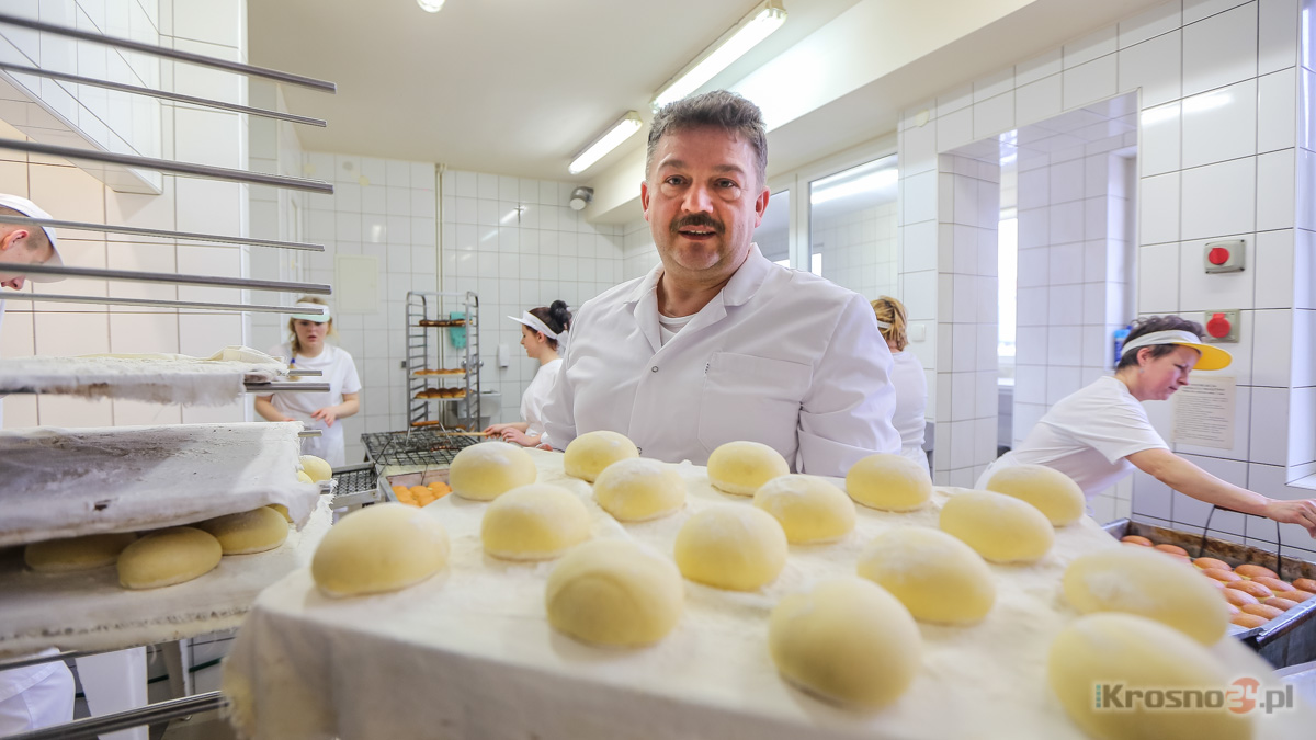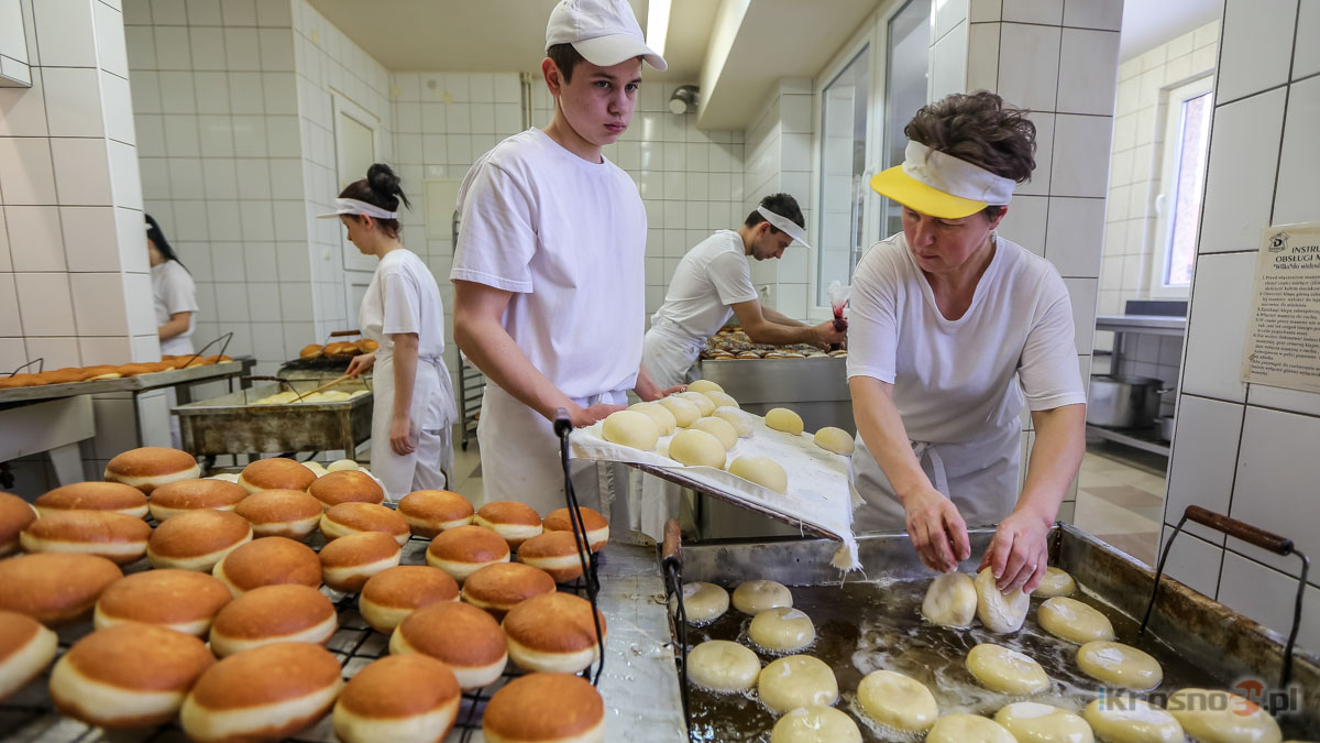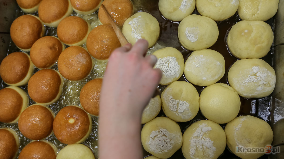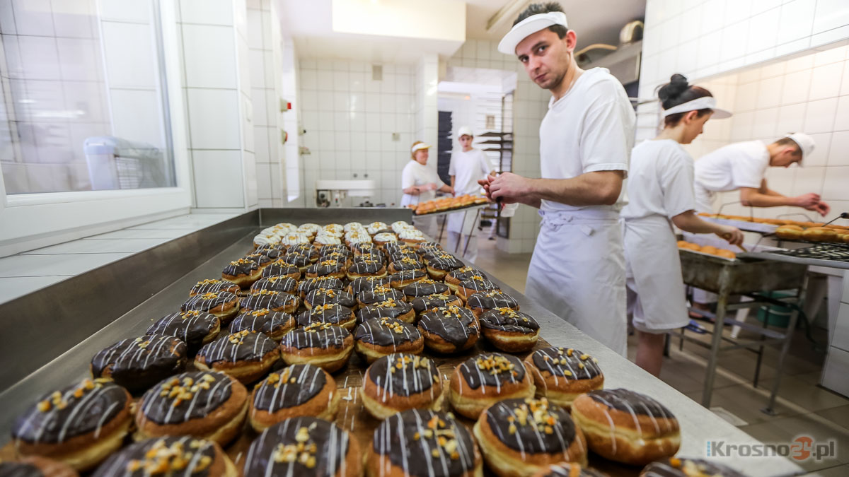 Wiadomość Przepis na 35 tysięcy pączkówW tym dniu smażą tylko pączki, bo nic innego się nie sprzeda. No może jeszcze poza powracającymi do łask faworkami. W przeddzień Tłustego Czwartku odwiedziliśmy krośnieńskich cukierników. Zobacz zdjęcia i film. ![]() Smażyli wczoraj wieczór i przez całą noc – na Tłusty Czwartek cukiernicy przygotowują ogromne ilości pączków. Tylko w jednej krośnieńskiej cukierni powstaje ich kilkadziesiąt tysięcy Środa (11.02), godz. 18.00. W Cukierni Jagusia pracę rozpoczyna 10 cukierników. Następnego dnia rano zmieni ich kolejnych 10 osób. Do dyspozycji mają: 800 kg mąki, 35 kg drożdży, 135 kg cukru, 175 litrów mleka i 200 litrów jaj. Przez najbliższych 20 godzin, z ponad tony produktów usmażą około 35 tysięcy pączków. Smażenia dogląda Andrzej Nycz – mistrz cukiernictwa, kierownik produkcji w Jagusi. – O! Ta polewa trochę brzydko, musisz poprawić. To ciasto za bardzo przyciśnięte – poprawić – instruuje co jakiś czas. – Jest pewien stres, bo chcemy żeby te pączki były jak najsmaczniejsze. No i żeby ładnie wyglądały. W końcu jutro Tłusty Czwartek – mobilizuje się załoga cukierni.Praca jest idealnie zorganizowana: jedni formują ciasto, drudzy smażą, kolejni nadziewają i dekorują. Między nimi wędrują blachy pełne pączków, a wokół nich unosi się słodko-tłusty zapach – mieszanka aromatów z różnego rodzaju nadzień i woni smażonego na bulgoczącym smalcu ciasta. ![]() W środę rano (11.02) w Jagusi usmażono 3 tysiące pączków. Sprzedały się w ciągu dnia, bo część osób, z obawy przed kolejkami, wolała je kupić przed Tłustym Czwartkiem Ciasto – Ciasto drożdżowe to jedno z najłatwiejszych do przyrządzenia ciast. Mąka, drożdże, cukier, jaja i mleko – mówi Andrzej Nycz. Wyrobione ciasto porcjowane jest na 2-kilogramowe kęsy. Każdy kęs dzielony jest na 30 części, z których powstają niewielkie kulki o średnicy kilku centymetrów. Te trafiają do pomieszczenia zwanego "garownią". – W garowni mamy temperaturę 40 stopni. Tutaj ciasto wyrasta. Pączki trzymamy tu przez trzy kwadranse – opowiada mistrz. ![]() Smażenie największej partii pączków rozpoczęło się w środę wieczorem i potrwa do dzisiaj do godz. 14.00 Smalec Wyrośnięte pączki wędrują do jednego z czterech smażalników. – Smażymy tradycyjnie, na smalcu. Smażyć można jeszcze na fryturze, w głębokim oleju. Na fryturze smaży się nawet łatwiej, bo temperatura jest wyższa. Dochodzi do 200-220 stopni. Na smalcu jest to około 180. Ale frytura pozostawia taki specyficzny, kokosowy smak – opisuje cukiernik. W rozgrzanym tłuszczu (powstał z 400 kg smalcu) pączki kąpią się przez około 10 minut: 5 minut z jednej strony, potem ktoś z załogi trąca je delikatnie drewnianym patyczkiem, robią obrót o 180 stopni i smażą się przez kolejnych 5 minut, aż będą rumiane z obu stron. ![]() Z różą, kremem lub konfiturą wiśniową. Z polewą czekoladową lub posypką z cukru pudru. Jeszcze kilkanaście lat temu o takim wyborze można było tylko pomarzyć Nadziewanie Ze smażalnika pączki trafiają w ręce osób, które je nadziewają. – Najpopularniejsze jest nadzienie różane. W sezonie skupujemy płatki róży, ucieramy i robimy marmoladę. Oprócz róży mamy też nadzienia z bitej śmietany, kremu waniliowego, adwokatu i wiśni – wylicza Andrzej Nycz. Dekoracja Pączki z różnym nadzieniem są różnie dekorowane. Do dekoracji używane są: cukier puder, lukier, czekolada, biała czekolada i skórka pomarańczowa. ![]() Ile kalorii ma pączek? – W Tłusty Czwartek pączki nie mają kalorii. W ten jeden dzień można je jeść bezkarnie – żartuje mistrz cukiernictwa Andrzej Nycz Które najbardziej lubią krośnianie? Klienci zazwyczaj kupują po 10-15 pączków. Zdarzają się jednak przypadki, że ktoś bierze ich nawet kilkadziesiąt. – To chyba do mniejszych sklepów albo do zakładów pracy – przypuszczają pracownicy cukierni. – W pierwszej kolejności kupują te klasyczne, z marmoladą różaną, posypane cukrem pudrem. Dużym zainteresowaniem cieszą się też te z konfiturą wiśniową, dopiero potem te z innymi nadzieniami – wynika z obserwacji ekspedientki. W Tłusty Czwartek, poza pączkami właściwie nic się nie sprzedaje. Poza pączkami i faworkami. ![]() Cukiernicy potwierdzają, że w ostatnich latach faworki wróciły do łask. Z roku na rok smażą ich coraz więcej Faworki Z faworkami (zwanymi także "chrustem") jest dużo więcej roboty: – Bazą ciasta na faworki są żółtka. Oprócz nich mąka i śmietana – dzieli się przepisem Andrzej Nycz. – Ciasto cieniutko wałkujemy, na grubość 1 mm. Następnie kroimy na porcje, na takie długie prostokąty, przecinamy ten prostokąt na połowę i przewijamy jeden koniec ciasta przez środek, przez to przecięcie. Na koniec smażenie i posypywanie cukrem pudrem. Całość jest bardzo czasochłonna. Cukiernicy zaobserwowali, że w ostatnich latach faworki stają się coraz bardziej popularne. Sprzedają się jednak wyłącznie w okolicach Tłustego Czwartku. – Można powiedzieć, że to ciastko jednego dnia – mówią. W tym roku w Jagusi przygotowano rekordową liczbę faworków – 150 kg (około 15 tysięcy sztuk). Z czym najlepiej smakują? – Panie Andrzeju, czy po usmażeniu 35 tys. pączków, będzie pan miał jeszcze ochotę zjeść pączka? – pytamy. (2015-02-12/06:06:06) |